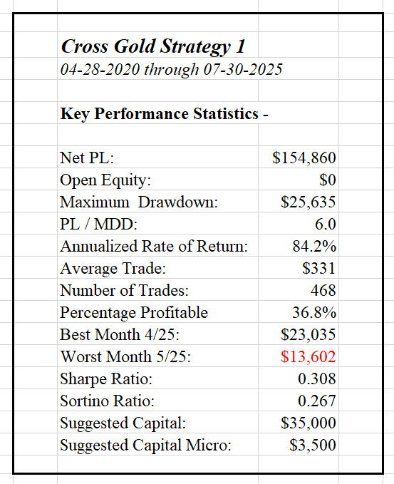 The Cross Gold strategies parameters were updated as of this posting. These statistics are internally consistent but will not tie out with previously posted statistics.
