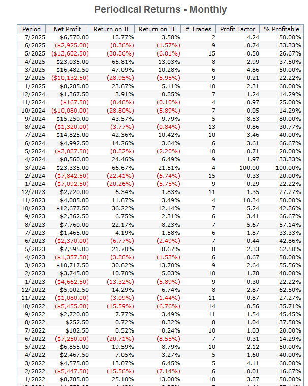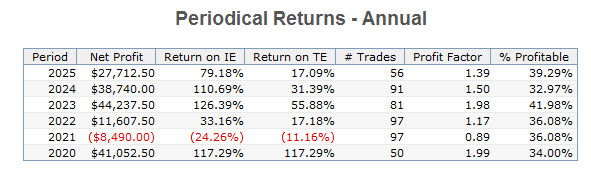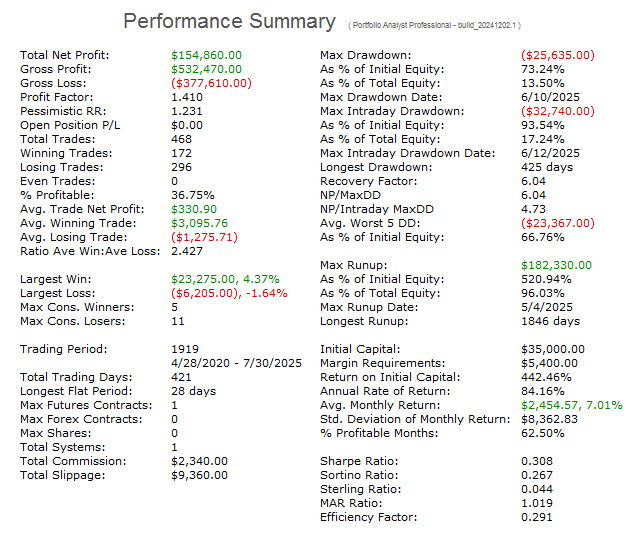 This is the equity curve and its statistical profile for the current Signal window. It covers data from 4-28-2020 through 7-30-2025.