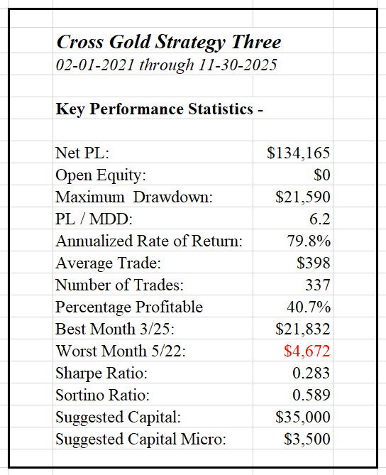 The Cross Gold strategies parameters were updated as of this posting. These statistics are internally consistent but will not tie out with previously posted statistics.