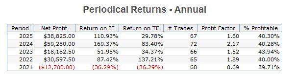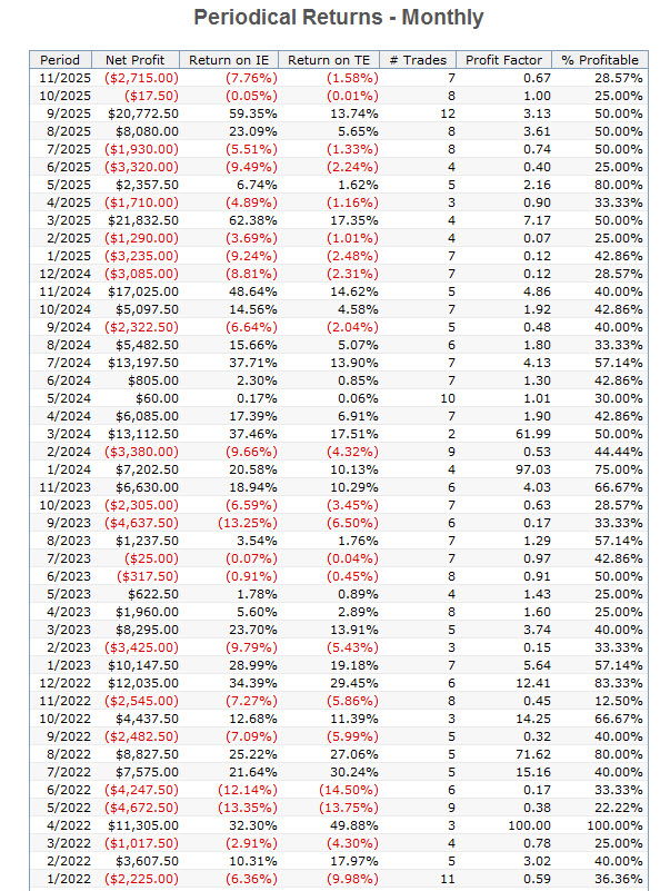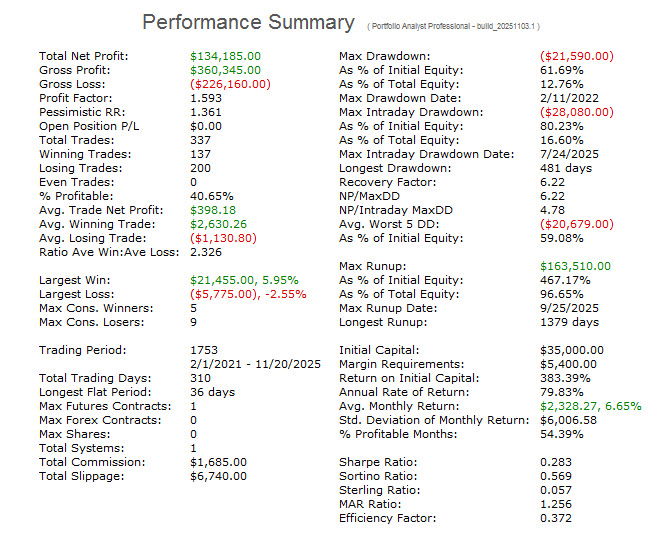 This is the equity curve and its statistical profile for the current Signal window. It covers data from 2-1-2021 through 11-30-2025.