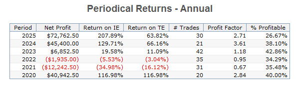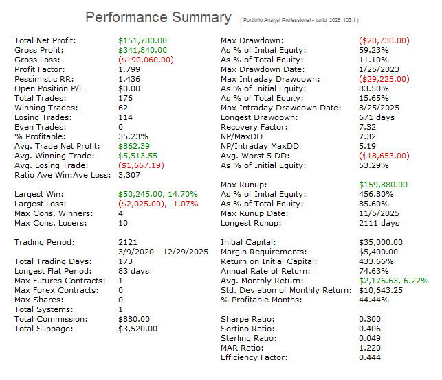 This is the equity curve and its statistical profile for the current Signal window. It covers data from 3-9-2020 through 12-29-2025.