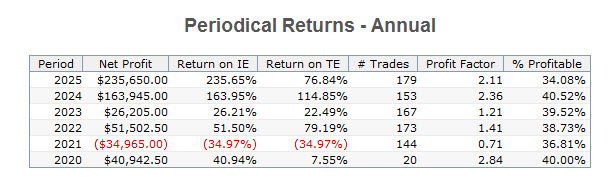 All of the Cross GC Trio strategies are built with our proprietary application of Walk-Forward Analysis. What is presented here under Current Performance is the performance of the most current WFA out-of-sample window for each strategy. Our process periodically evaluates the performance of what we call the Static version (included) of the strategy, i.e., the performance of the optimization space, with that of the Dynamic version of the strategy, which is its performance under Walk-Forward Analysis. We select the strategy which exhibits the best current performance. This can and will change from time to time. The performance of the Static portfolio is next presented in the Historical Performance section.