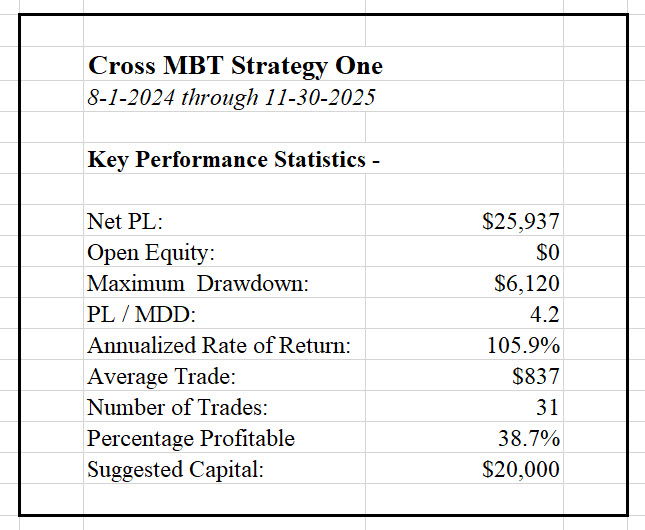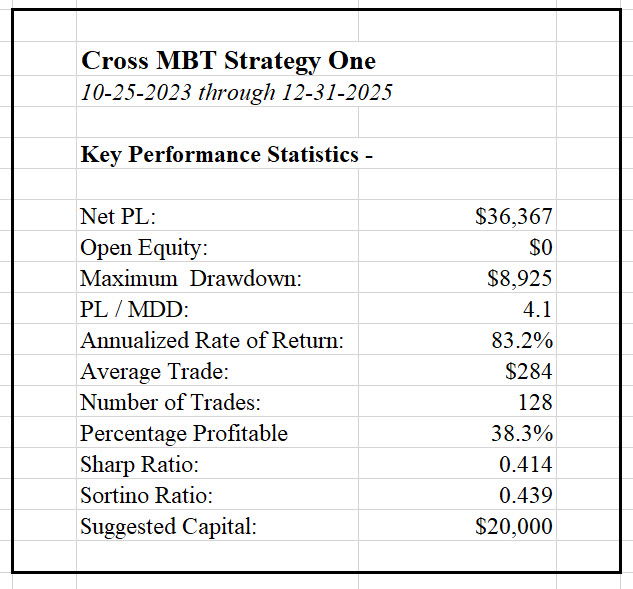 This is the performance of the Cross MBT Trio Strategy One Signal workspace. This is the strategy that is traded.