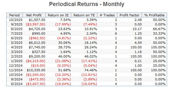 This is the equity curve and its statistical profile for the current Signal window. It covers data from 8-1-2024 through 11-30-2025.