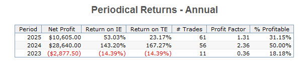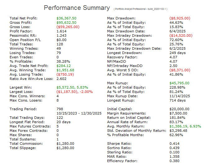This is the equity curve and its statistical profile for the current Signal window. It covers data from 10-25-2023 through 12-31-2025.