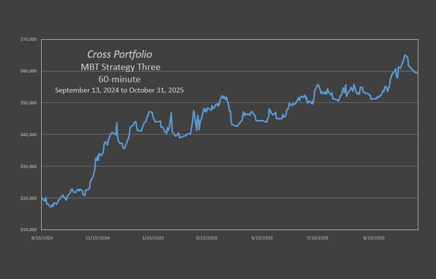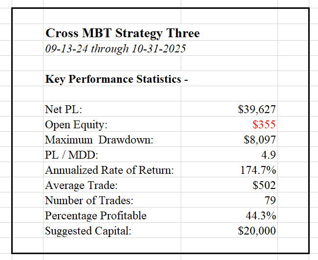 This is the performance of the Cross MBT Trio Strategy Three Signal workspace. This is the strategy that is traded.