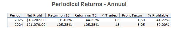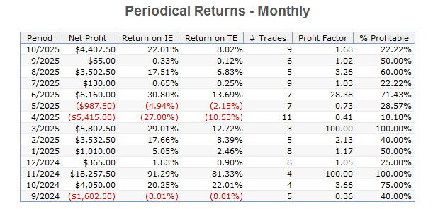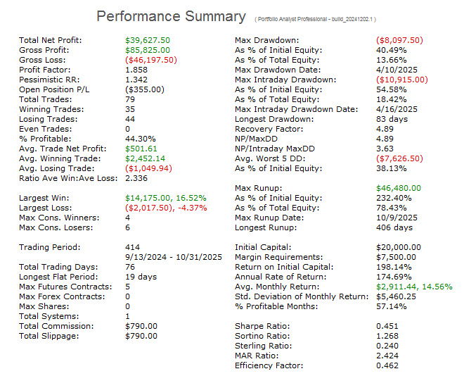 This is the equity curve and its statistical profile for the current Signal window. This covers data from 9-13-2024 through 10-31-2025.
