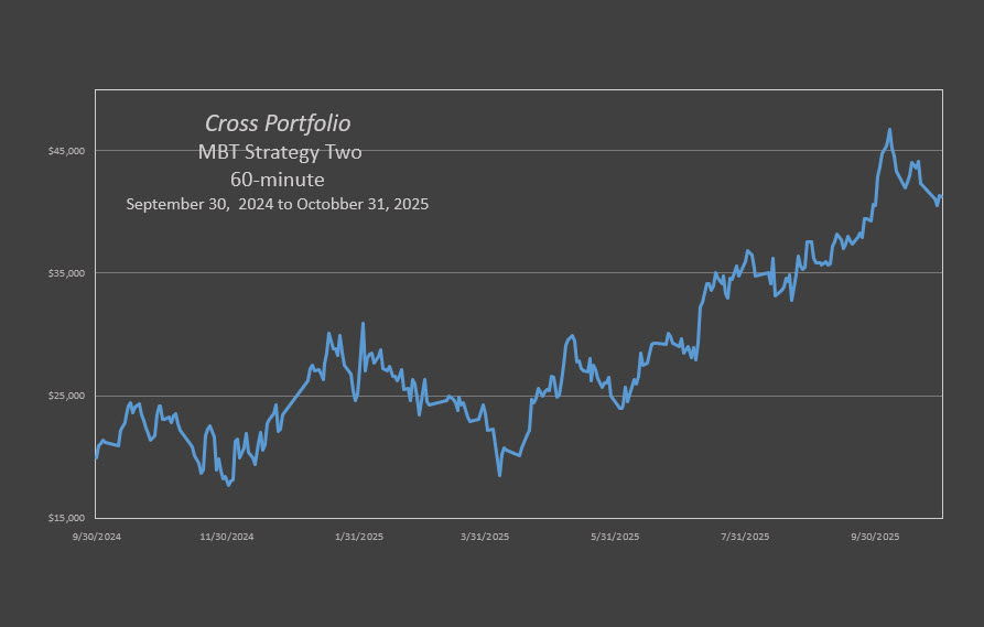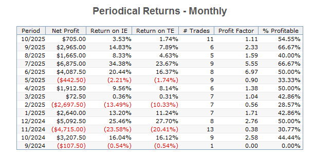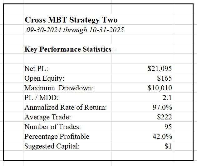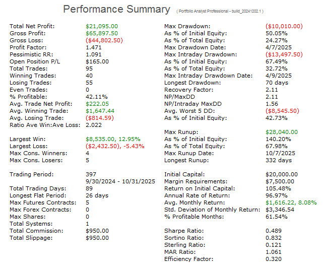 This is the equity curve and its statistical profile for the current Signal window. This covers data from 9-30-2024 through 10-31-2025.