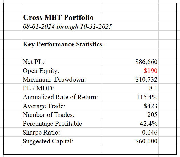 The Cross MBT-1 portfolio (not yet documented here but now available) can be traded with a suggested account size of $12,000. Rates of return are the same but PL and Drawdown ae each 20% of the values shown below for the Cross MBT-5 documented here.