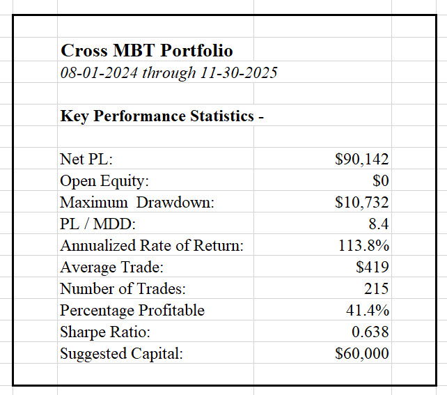 The Cross MBT-1 portfolio (not yet documented here but now available) can be traded with a suggested account size of $12,000. Rates of return are the same but PL and Drawdown ae each 20% of the values shown below for the Cross MBT-5 documented here.