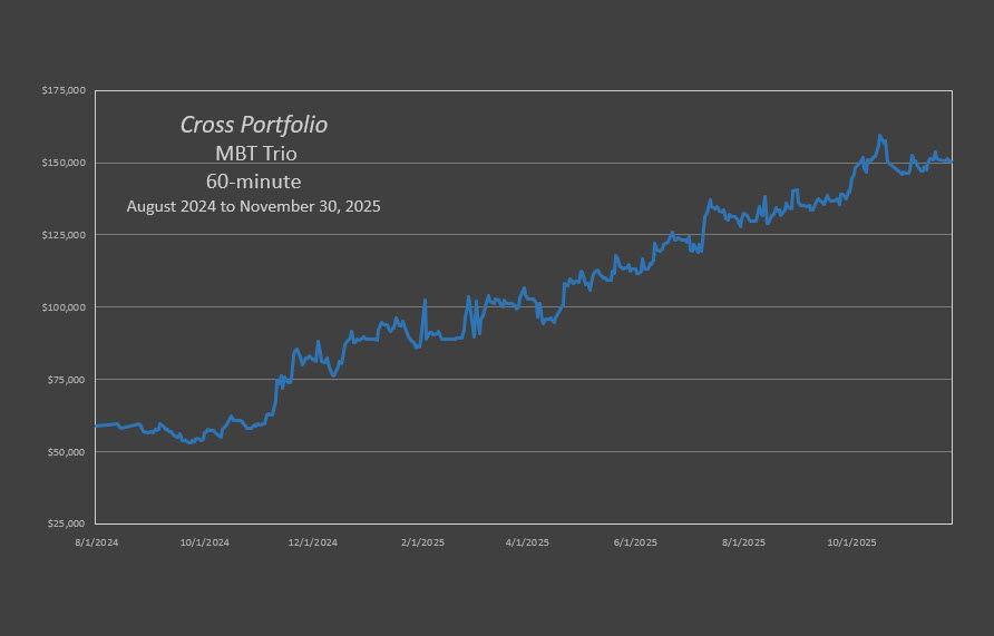 All Cross MBT Trio strategies are built on a historical look-back from March 1, 2021 through December 31, 2022. Due to the different sizes of the WFA windows used in these strategies, Current Performance starts 08/01/2024 and is through 09-30-2025. Updates entail the use of a new more current optimization window so the overall performance will not be 5continuous with that of previous updates so comparing performance over parameter updates will not make sense. The start point for these windows is 10/2023 versus that of the last update which was 4/2023. However, the results are internally consistent.