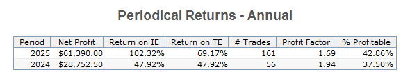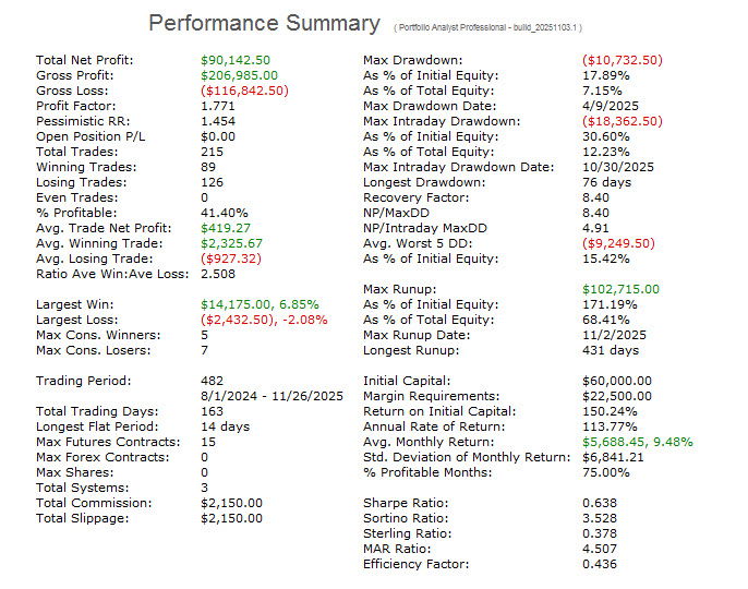 This is the performance of the Cross MBT-5 Trio Signal workspaces. These are the strategies that are traded. Due to the shorter Walk-Forward windows in use this cycle, the look back is limited to the shortest window which starts in 8/2024