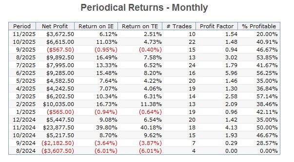We have established a relationship with two excellent clearing firms which can auto-trade this portfolio for you on the full size or micro contracts. If you are interested in this reach out to us via our Contact page - https://www.pardo.space/contact.