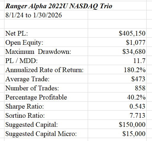This Ranger Alpha 2022 NQ Portfolio consists of a counter trend, neutral trend and with trend strategy.