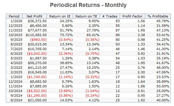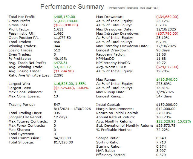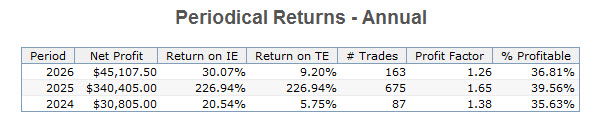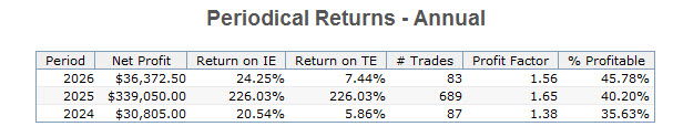 This provides a look at the performance of the strategy over its development period via traditional optimization. It is not a walk-forward analysis. The performance above reflects that of the most current trading window calculated by walk-forward analysis and it is what is traded. The information that follows is for historical perspective. Its performance does not reflect that of the current WFA trading window above. These models are also included with any purchase of the Ranger Alpha strategies.