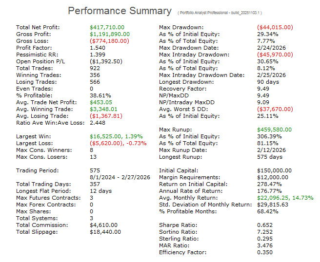 First is performance for the three strategy portfolio which is the most current walk-forward windows. These are of variable length based on the length of the selected walk-forward.