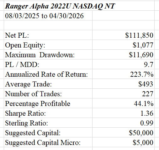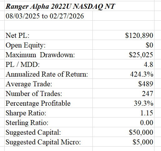 These statistics are for the Ranger Alpha 2022 NQ Neutral Trend strategy.