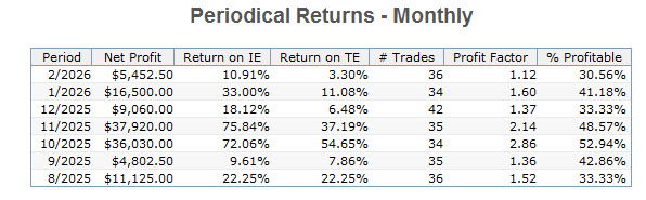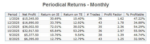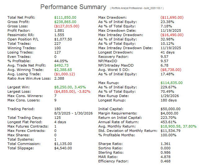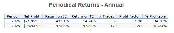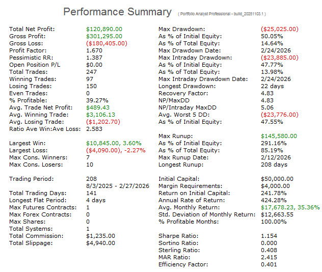 This provides a look at the performance of the strategy over its development period via traditional optimization. It is not a walk-forward analysis. The performance above reflects that of the most current trading window calculated by walk-forward analysis and it is what is traded. The information that follows is for historical perspective. Its performance does not reflect that of the current WFA trading window above. These models are also included with any purchase of the Ranger Alpha strategies.