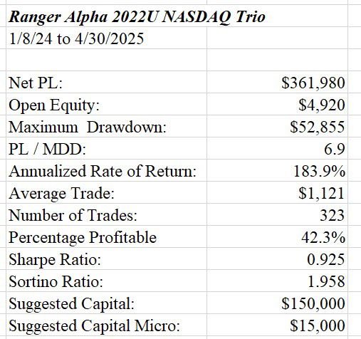 This Ranger Alpha 2022 NASDAQ Trio consists of a counter trend, neutral trend and with trend strategy.