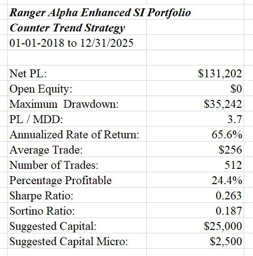 CFTC RULE 4.41 - HYPOTHETICAL OR SIMULATED PERFORMANCE RESULTS HAVE CERTAIN LIMITATIONS. UNLIKE AN ACTUAL PERFORMANCE RECORD, SIMULATED RESULTS DO NOT REPRESENT ACTUAL TRADING. ALSO, SINCE THE TRADES HAVE NOT BEEN EXECUTED, THE RESULTS MAY HAVE UNDER-OR-OVER COMPENSATED FOR THE IMPACT, IF ANY, OF CERTAIN MARKET FACTORS, SUCH AS LACK OF LIQUIDITY. SIMULATED TRADING PROGRAMS IN GENERAL ARE ALSO SUBJECT TO THE FACT THAT THEY ARE DESIGNED WITH THE BENEFIT OF HINDSIGHT. NO REPRESENTATION IS BEING MADE THAT ANY ACCOUNT WILL OR IS LIKELY TO ACHIEVE PROFIT OR LOSSES SIMILAR TO THOSE SHOWN.